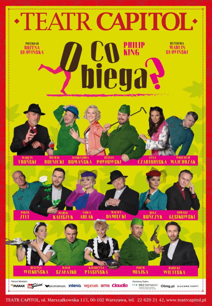 „O co biega?“ to jedna z najzabawniejszych światowych komedii autorstwa Philipa Kinga. Pełna zaskakujących zwrotów akcji historia, z minuty na minutę, choć wydaje się to już niemożliwe, staje się jeszcze śmieszniejsza. Do samego końca nie wiadomo, kto jeszcze pojawi się nagle w drzwiach lub niespodziewanie wyskoczy z szafy!